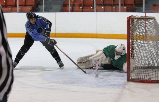 Rinkrats' Dave Roode scores on YFM's Cody Cuvelier.